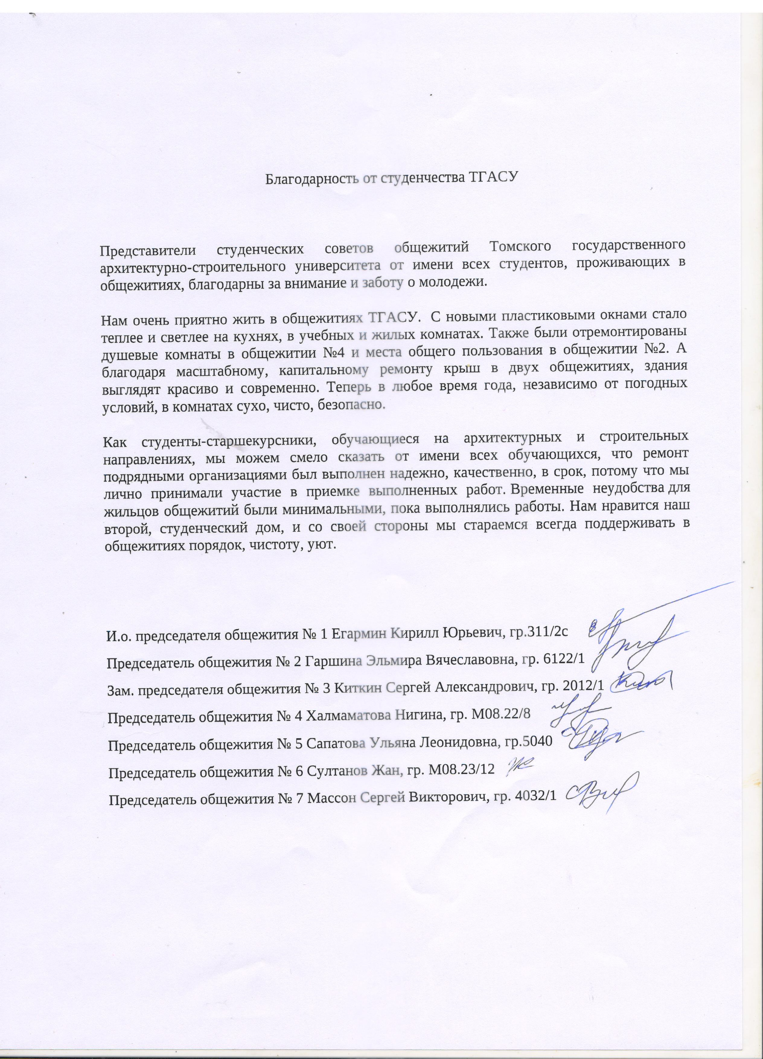 За качественно выполненные работы студенты и председатели советов общежитий в открытом письме поблагодарили руководство ТГАСУ и Минобрнауки РФ.